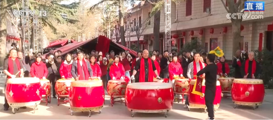总台记者 张恩雨:此刻,我是在袁家村的村口,同时也是村里百人锣鼓队表演的现场。在陕西关中农村地区,每年过年每个村子都会有这样的锣鼓表演,村民们告诉我,锣鼓声一响,年就到了。大家可以看到,我身后的锣鼓队队员们是激情昂扬、气势如虹。这些铿锵有力的鼓点,正是关中地区非常有名的曲目《秦汉战鼓》,没有繁复的花腔,而是重在力量和气势。特别值得一提的是,这支队伍里年龄最大的已经75岁,最小的只有26岁,而且所有人都是零基础的村民,仅仅集中学习了10来天,就呈现出了今天这样的气势。