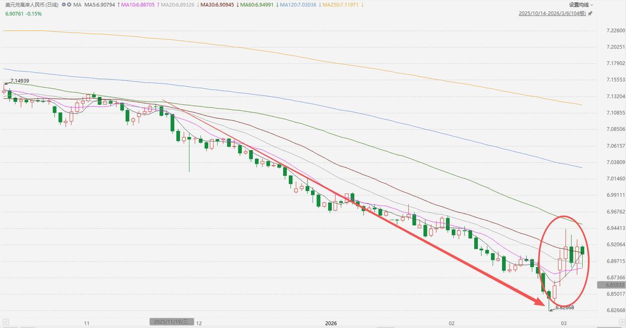 这一波上涨一直持续到今年的2月下旬,在2月26日人民币离岸汇率最高达到了6.8266。