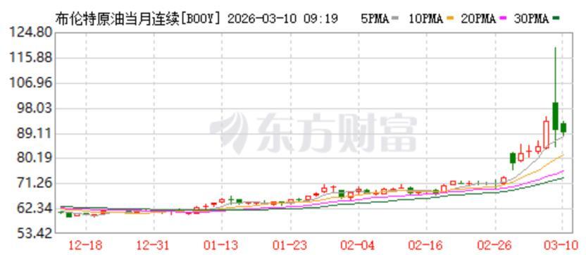 破百油价更是给了美国经济一个重大打击。受霍尔木兹海峡航运受阻影响,3月9日,国际油价突发疯涨,开盘飙升30%,盘中一度逼近120美元/桶,即便G7拟释放石油储备降温,截至当日WTI原油仍报102美元,布伦特原油104美元,稳稳站在百美元关口之上。