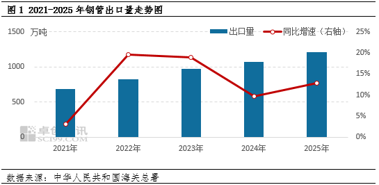 近年来钢管出口呈现逐年增加的趋势,分析来看国外基础设施用管的需求增加,发展中国家城市化进程明显加速,同时能源价格高企,油气开采作业增多,带动国外油井管需求,叠加国内钢管内需不足和人民币贬值趋势,国内钢管资源出口竞争力明显增加,在多因素驱动下,钢管出口整体呈现稳步增加趋势。2025年,除了主要出口国强劲的基建需求拉动外,国际贸易政策多变调整背景下,“抢出口”需求进一步助推了出口继续走高,据中华人民共和国海关总署数据显示,2025年钢管出口总量为1208.23万吨,同比增幅12.90%,出口量再创新高。