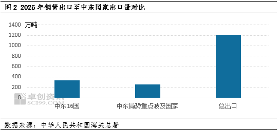 分品种来看,基于中东国家主要以油气开采资源为主,油气开采以需求无缝管为主,因此中东国家对钢管品种的需求中,无缝管需求多于焊管需求,此次中东局势对无缝管出口的影响明显大于焊管。据中华人民共和国海关总署数据显示,2025年中国无缝管出口至中东16国的出口量累计为234.57万吨,占2025年无缝管总出口量的39.24%,占比接近40%,影响较明显。而焊管出口至中东16国的出口量为100万吨左右,占2025年焊管总出口量的16.68%。对比来看,无缝管受影响的程度大于焊管,短期无缝管的出口需求减幅或将大于焊管。